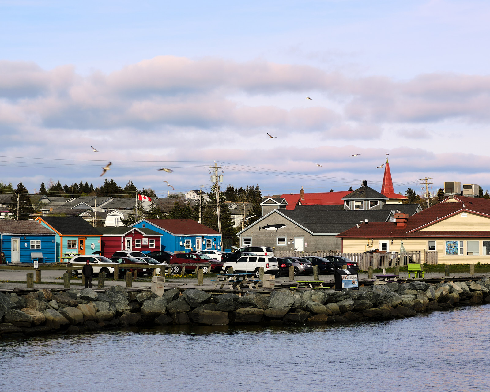 Fisherman’s Cove waterfront is seen at sunset with seagulls in the sky, pink clouds, and the red spire of Saint Andrew Church.