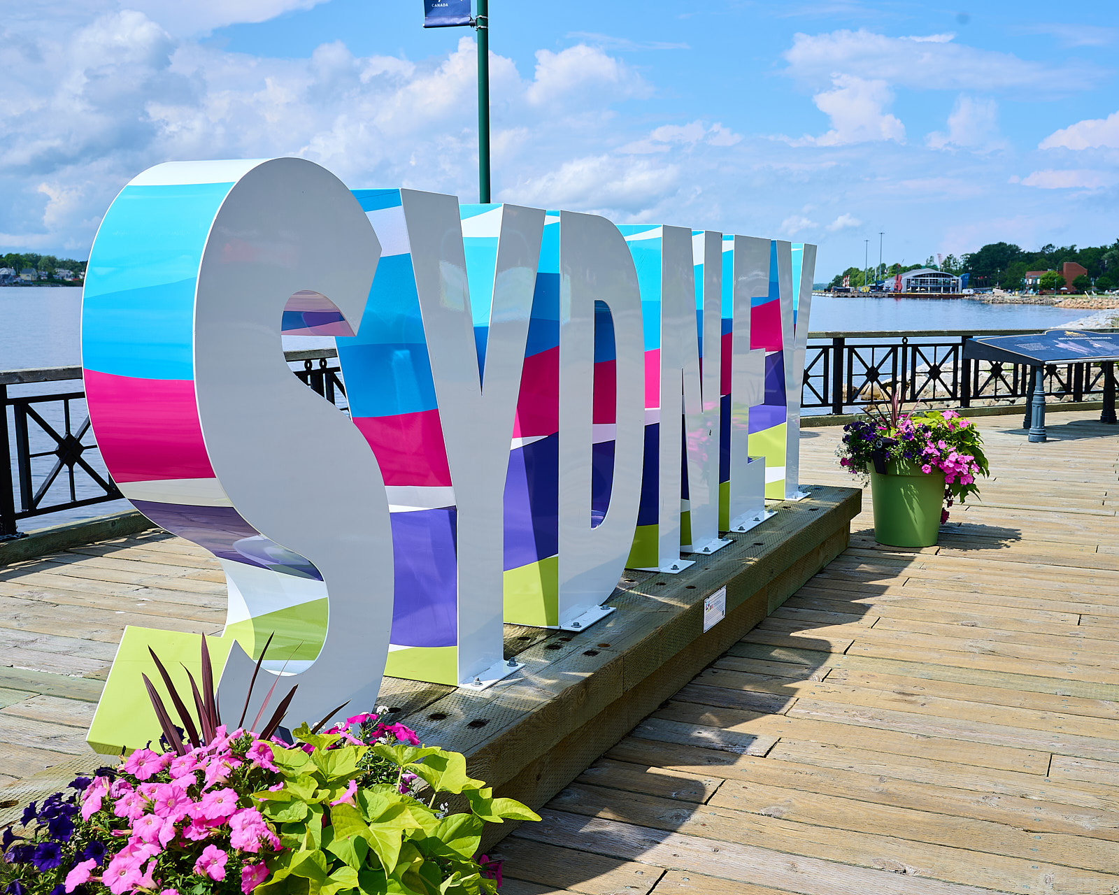 The big Sydney sign kicks off the walk along the waterfront, seen here with flower planters along it’s boardwalk on a sunny day.