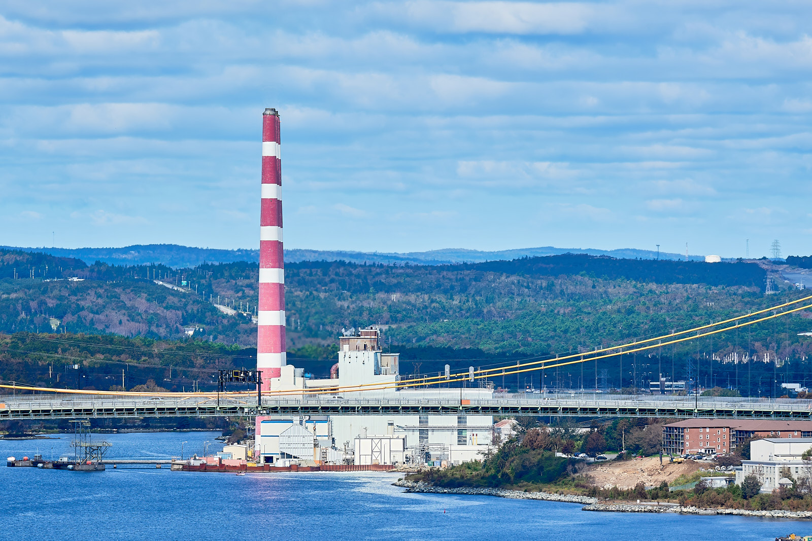 Tufts Cove Generating Plant, seen from the side with the MacKay bridge in the foreground, and the trees of Dartmouth and Bedford in the background.